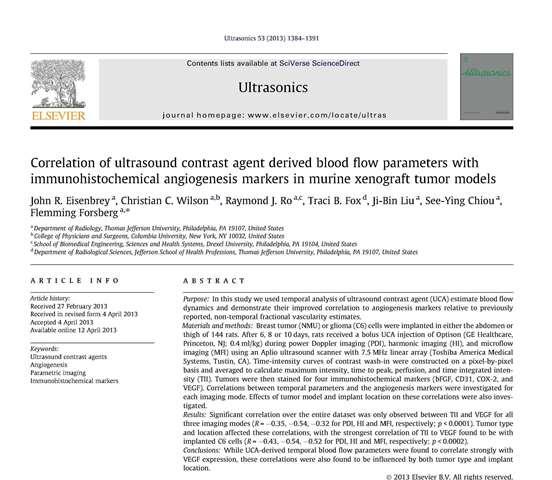F. Forsberg, R. J. Ro, T. B. Fox, et al., “Contrast Enhanced Maximum Intensity Projection Ultrasound Imaging for Assessing Angiogenesis in Murine Glioma and Breast Tumor Models: A Comparative Study,” Ultrasonics, vol. 51, pp. 382-389, 2011.