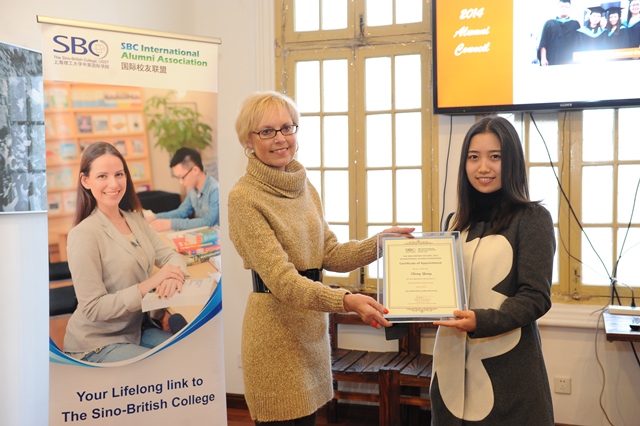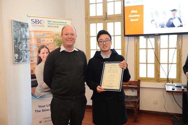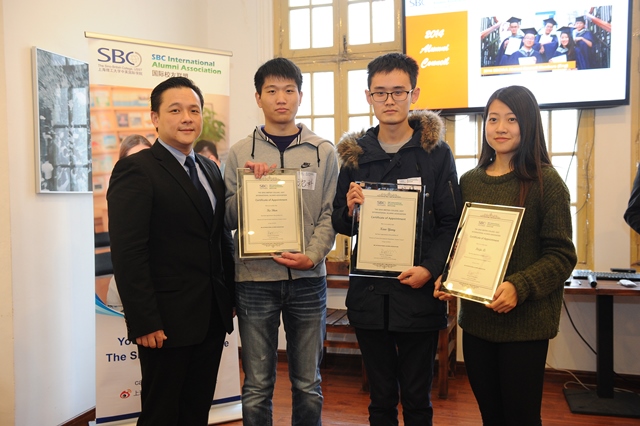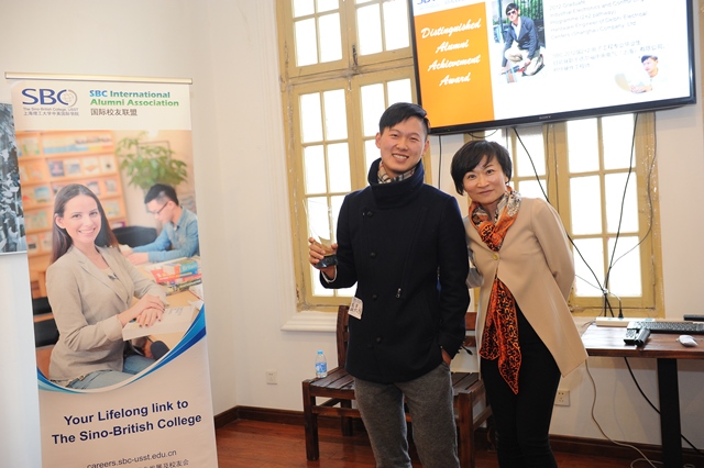 接着,杨静思女士颁出了2014年度杰出校友最佳贡献奖。今年, 2008级SBC电子电气专业毕业生、现任德尔福中央电气(上海)有限公司硬件工程师的盛昊骏荣膺此奖。作为校友导师队伍中的一员,盛昊骏时常为SBC的学生们提供学业和职业上的引导。此外,他还经常出现在各类宣传活动中,代表SBC向公众展现一个积极正面的形象。今年,在他的大力推进下,SBC国际校友联盟更与谢菲尔德学生学者联谊会建立了紧密的合作关系,为广大出国深造的学生们提供了实质性的帮助。