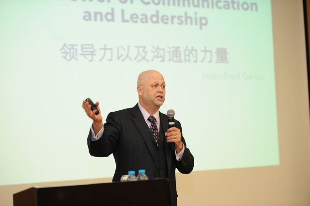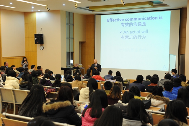 加西亚教授在讲座上跟同学们分享自己有关商务背景下沟通和领导力的研究成果。他讲到了沟通中的准则和障碍,并与同学讨论如何克服这些障碍。另外,通过观看视频,回答问题的现象互动测试,加西亚教授生动形象地为大家解释了现实生活中人是很难集中注意力的,以及所谓同时处理多项工作的能力是不存在的。从这一现象,加西亚教授引出了保证有效沟通的第一个重点就是要有清晰的沟通目的。讲座结束后,加西亚教授向SBC图书馆赠送了自己发表的新书《沟通的力量》。