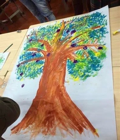这次志愿者们来到天平社区“阳光之家”,不仅是为了给智障人士们送去温暖和鼓励,也是为了和他们携手,共同唤起人们环保生活的观念,播撒绿色的种子。尽管志愿者们大部分是第一次接触智障人士,但凭着真诚的交流与沟通,他们很快就取得了对方的信任。随后志愿者们为他们准备了颜料,耐心地示范,细致地引导,大家以手指为画笔共同创作了两棵颇富创意的“七彩树”,寓指我们共同生活在一片蓝天下,看见的是同一抹绿色,呼吸的是同样的空气,为环境献出自己哪怕微薄的力量是我们的责任和义务。