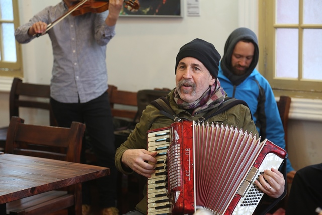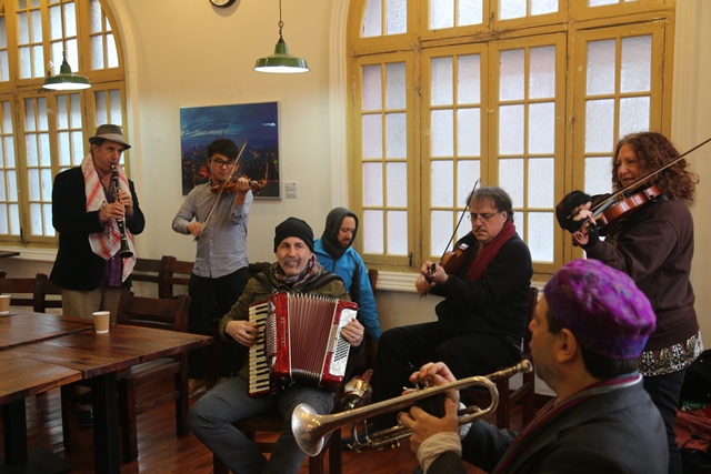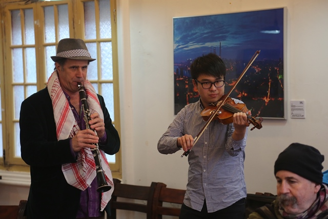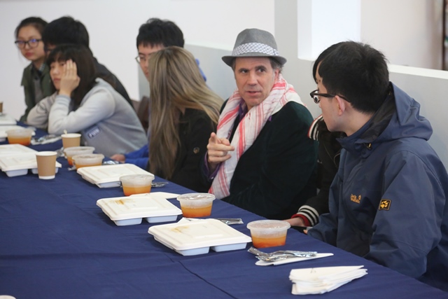 12点左右,午餐会正式开始。大家在享受美食的同时,双方就音乐领域的相关问题展开了热烈的讨论和交流。从古典音乐到流行音乐,从西洋乐器到中国传统乐器,从中华文化到西方文明,大家无话不谈,兴致颇高,完全沉浸在一片忘我的艺术交流氛围中。谈到尽兴处,Klezmatics乐队的成员竟情不自禁地拿出自己的乐器演奏起来,一曲不够,便再来一曲, SBC艺术团的成员也不由自主加入进来一起演奏合唱,双方完全没有了初次见面的陌生感,很快把交流活动推向了高潮。