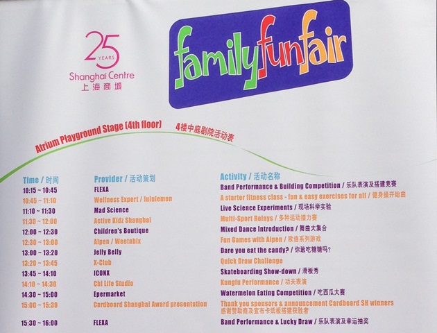 本次主题是向参与活动的家庭推广健康生活,快乐生活的理念。整个活动范围覆盖上海商城一楼和中庭。在一楼,大约有50个商家贩售由农场直供的新鲜食物和相关健康产品。同时,来自上海9所国际学校的学生乐团在一楼开放式舞台上进行音乐表演。另外,在中庭,家长和孩子们还可以参与由Awesome Kid’s Club 组织的“纸板城市”互动活动,用纸板箱来搭建和装饰模型建筑。靠近“纸板城市”活动区域附近 有一个适合3到10岁儿童的游戏区很受欢迎。里面有许多游乐设施和项目包括:轮滑坡道、舞蹈体育表演和两个充气城堡。