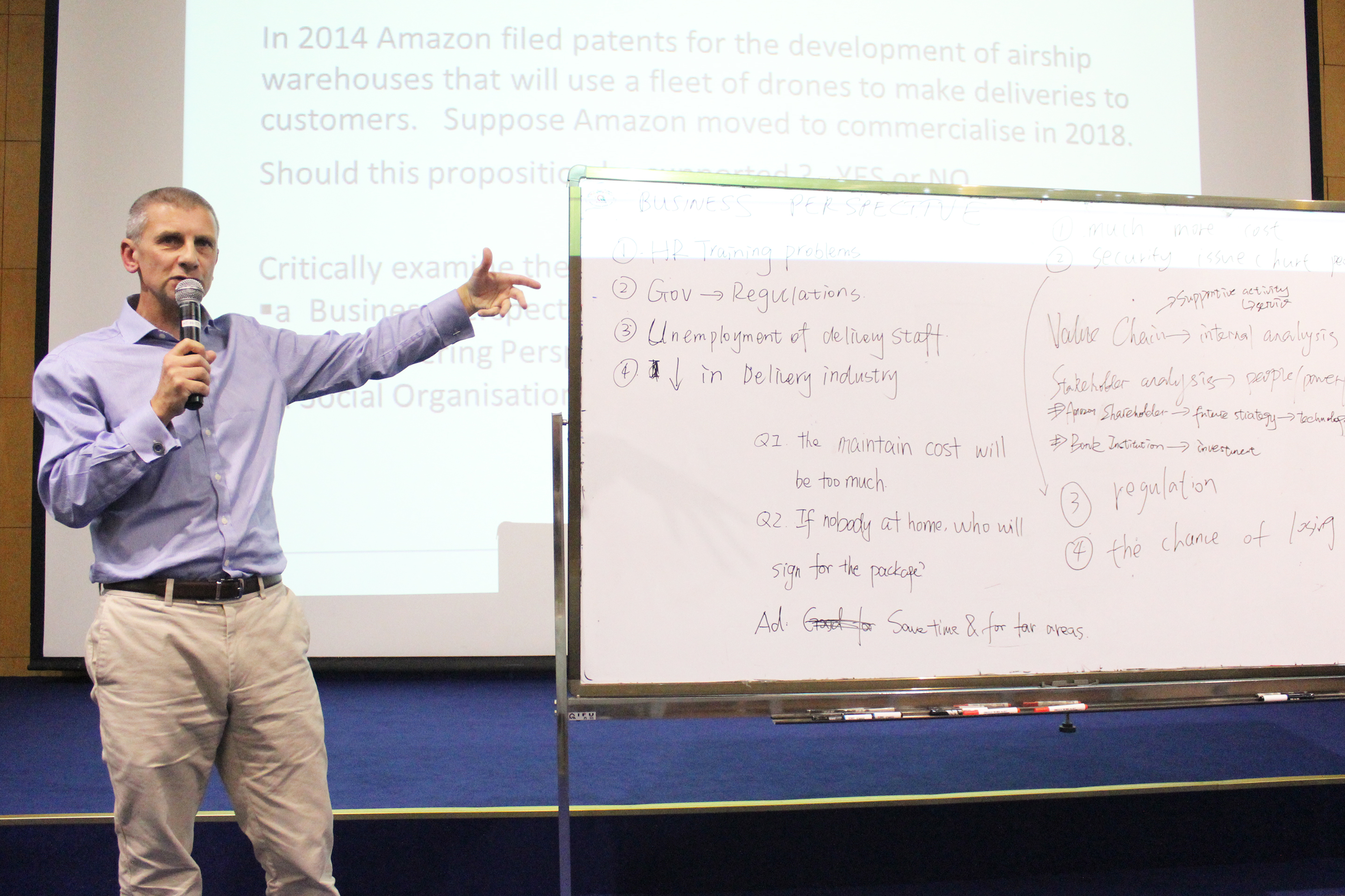 在第一天讲座主题为“Critical Thinking”的讲座中,Mike Mannion教授详细分析了批判性思维的内容与定义后,他通过分享一个关于是否支持用无人机快递物品的实际案例鼓励在场学生进行小组讨论,并运用批判性思维从不同的角度分析案例。最后,Mike Mannion教授表示“批判性思维的形成是在价值观、技能和知识三者间互相影响下的结果。”