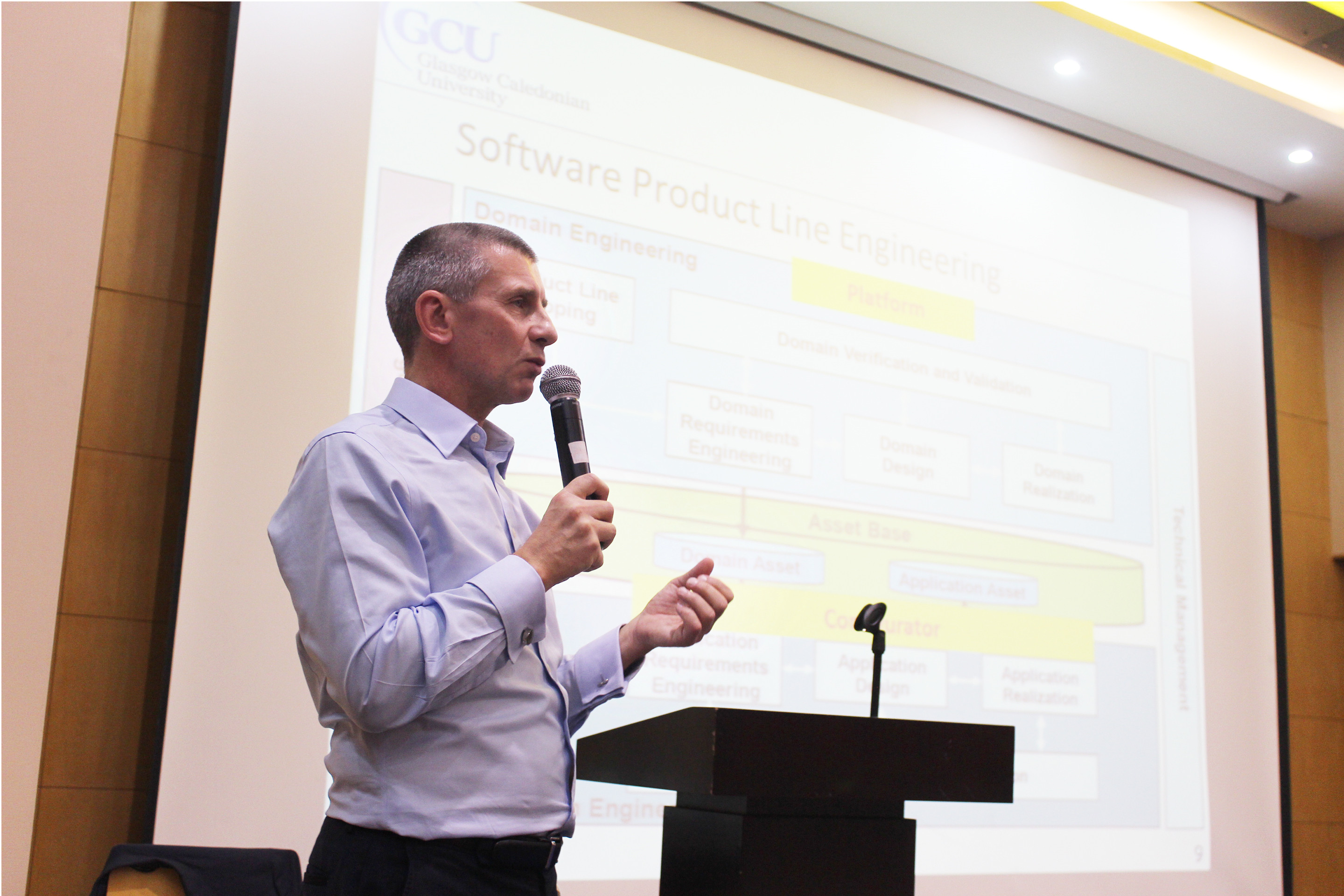 第二天的讲座主题是“An Introduction to Software Product Line Engineering”. Mike Mannion教授首先介绍了高效的软件产品的开发过程,同时对软件产品线的理论基础做了详细分析与讲解。Mike Mannion教授表示“软件产品线已经启用于目前许多产品的创造与开发,同时在面对工程领域的个性化产品问题上也面临着不小的挑战。”