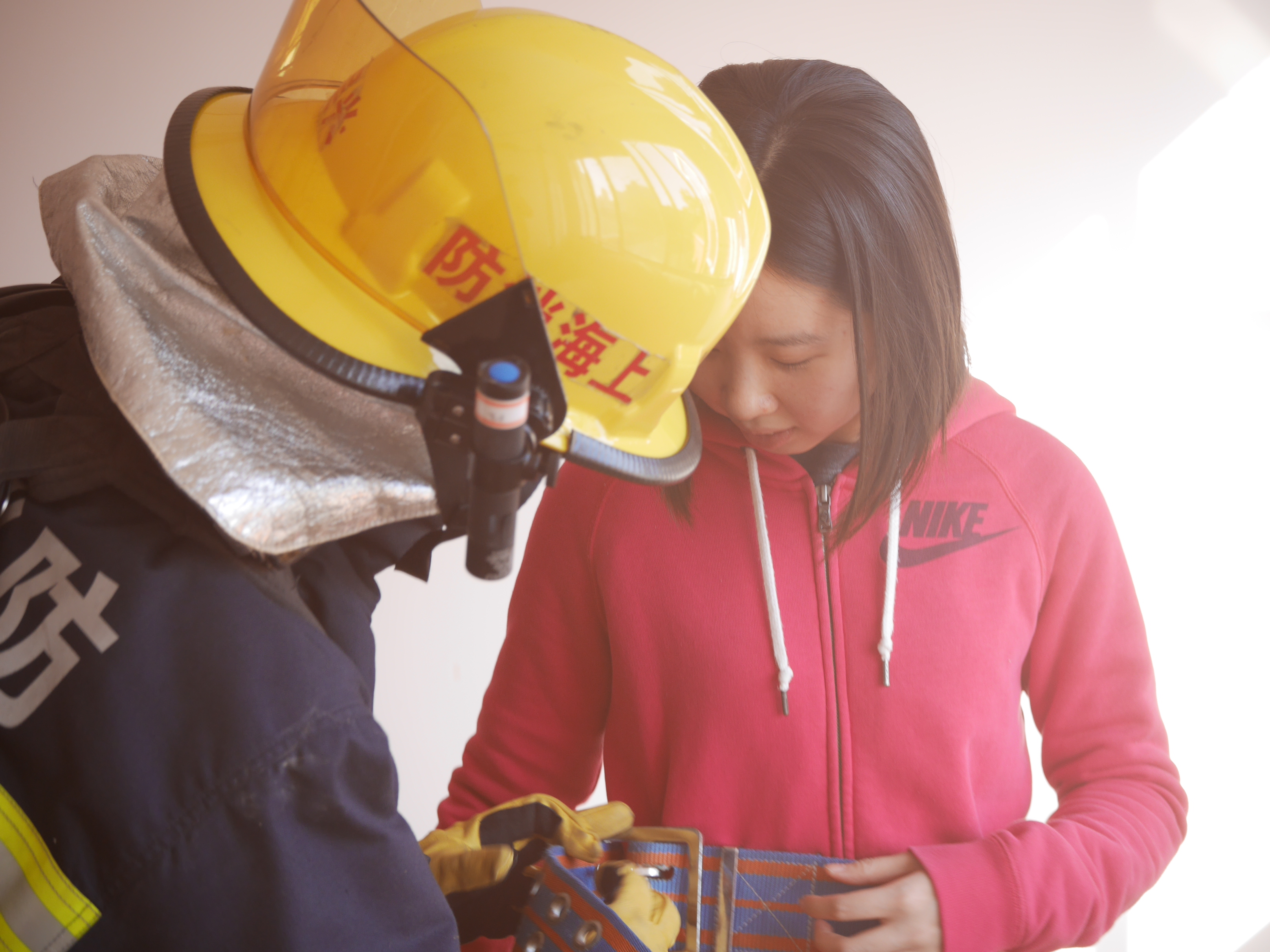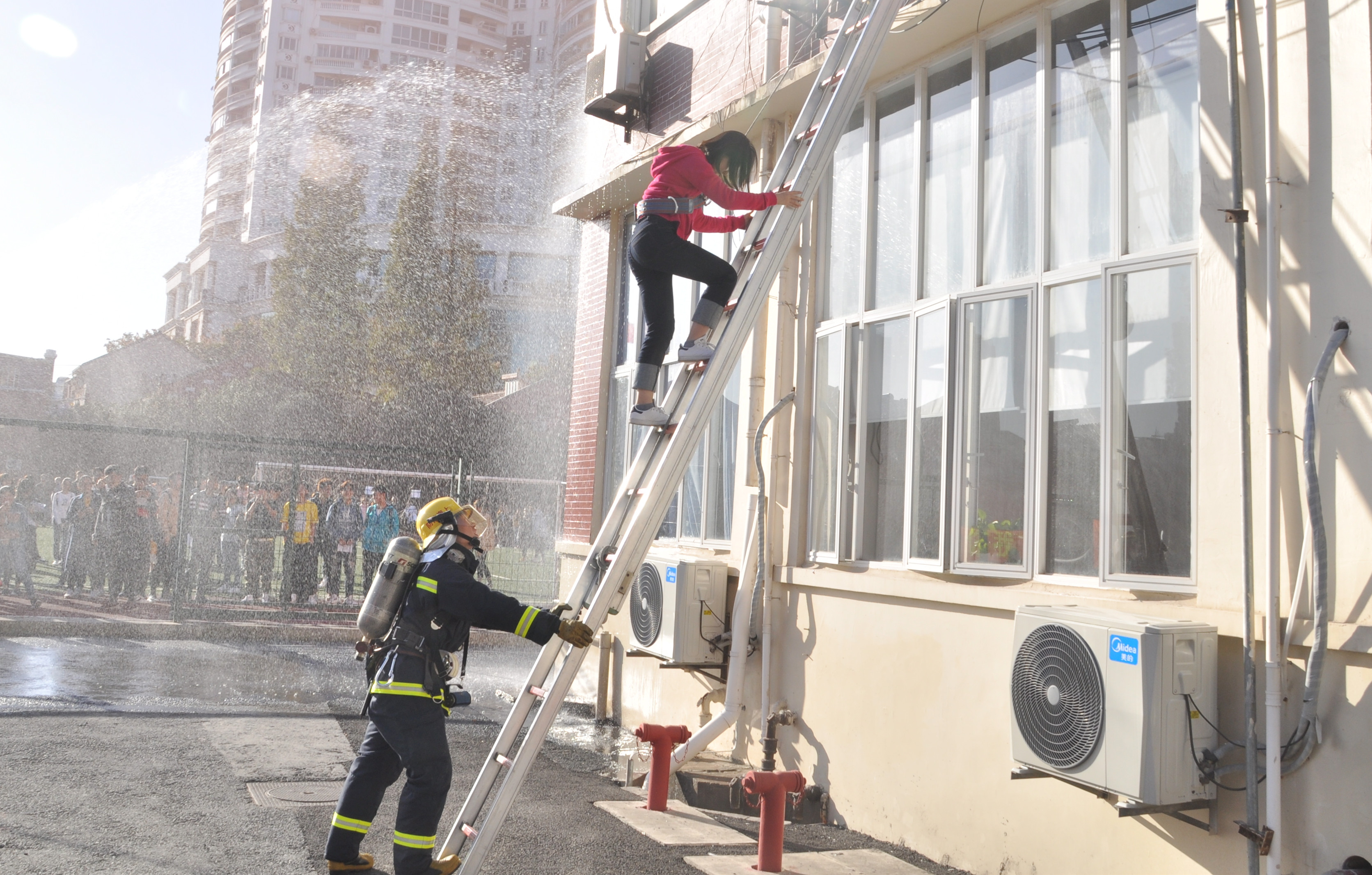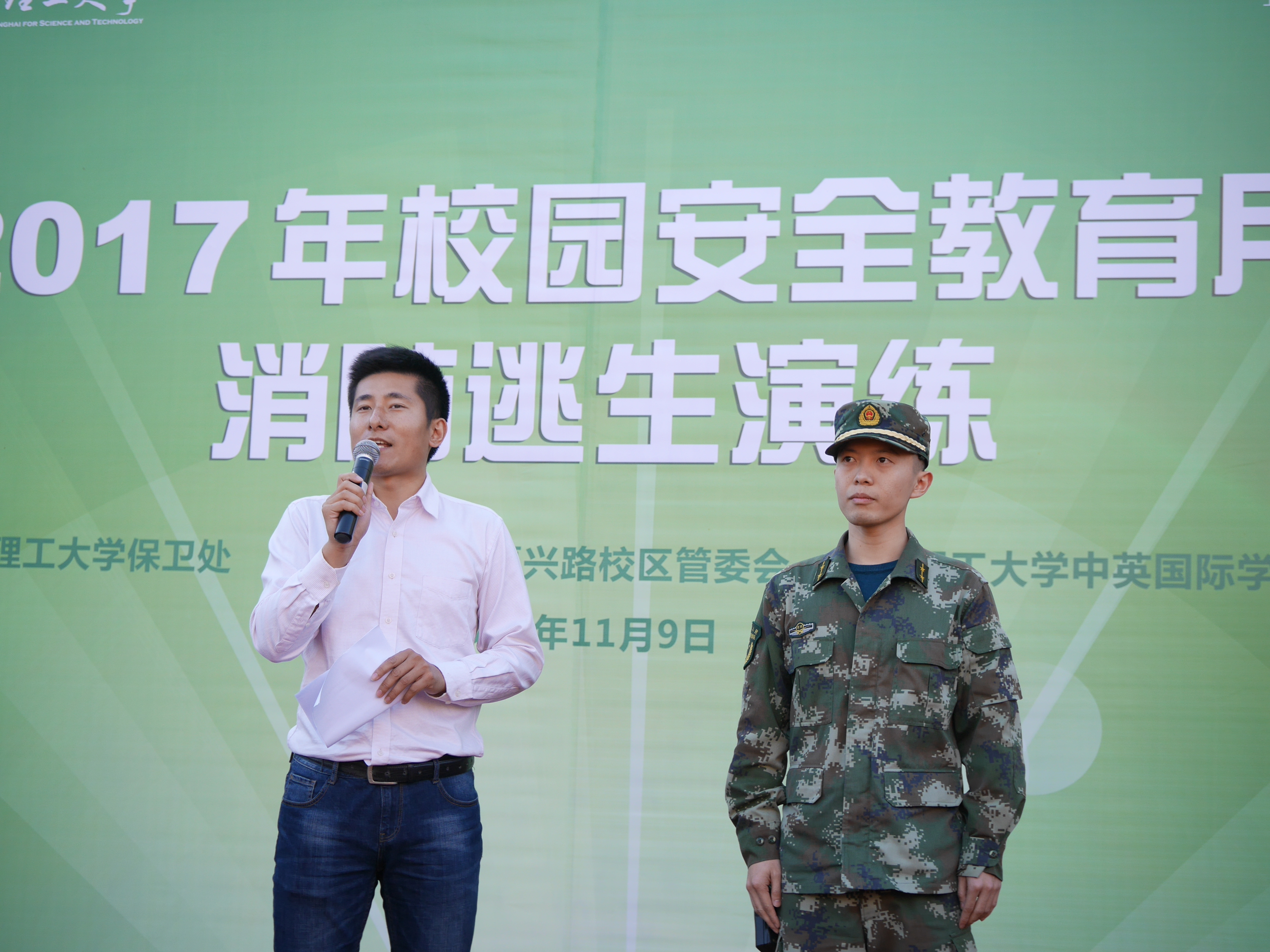 在一系列的消防安全宣讲活动后,11月9日下午三点整,学院健康与安全委员会紧锣密鼓地展开校园安全消防逃生演练。演练假设在教学楼二楼一间教室起火,随着一阵急促的警铃声,演练正式开始,徐汇区消防支队吴兴中队消防官兵立即组织人员进行疏散并进行灭火实战演练。在消防人员和志愿者的带领下,学院全体师生用湿毛巾捂住口鼻,弯腰进行疏散,撤离到安全地带。由于逃生通道被蔓延火势阻断,有一名学生被困于“火灾现场”,消防人员站在升降架将这名学生救了下来。总指挥上海理工大学保卫处杨向宁副处长宣布消防演练结束,杨向宁副处长和中英国际学院执行院长John Wilson教授将写有“服务校园安全,共建平安校园”的锦旗送到了徐汇区消防支队吴兴中队乔云副队长的手中,以此感谢消防大队对中英国际学院校园安全给予的工作指导和热情帮助。