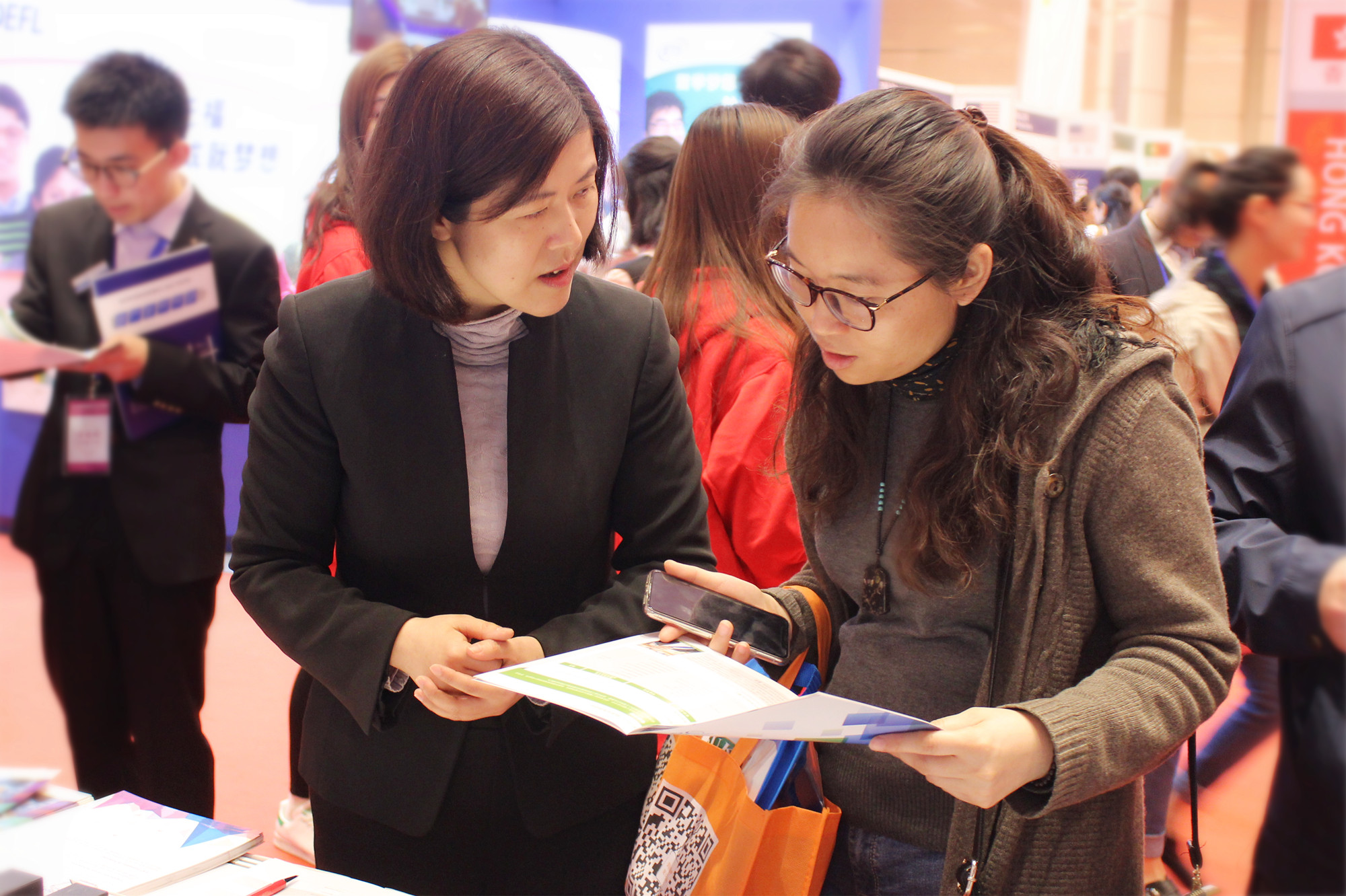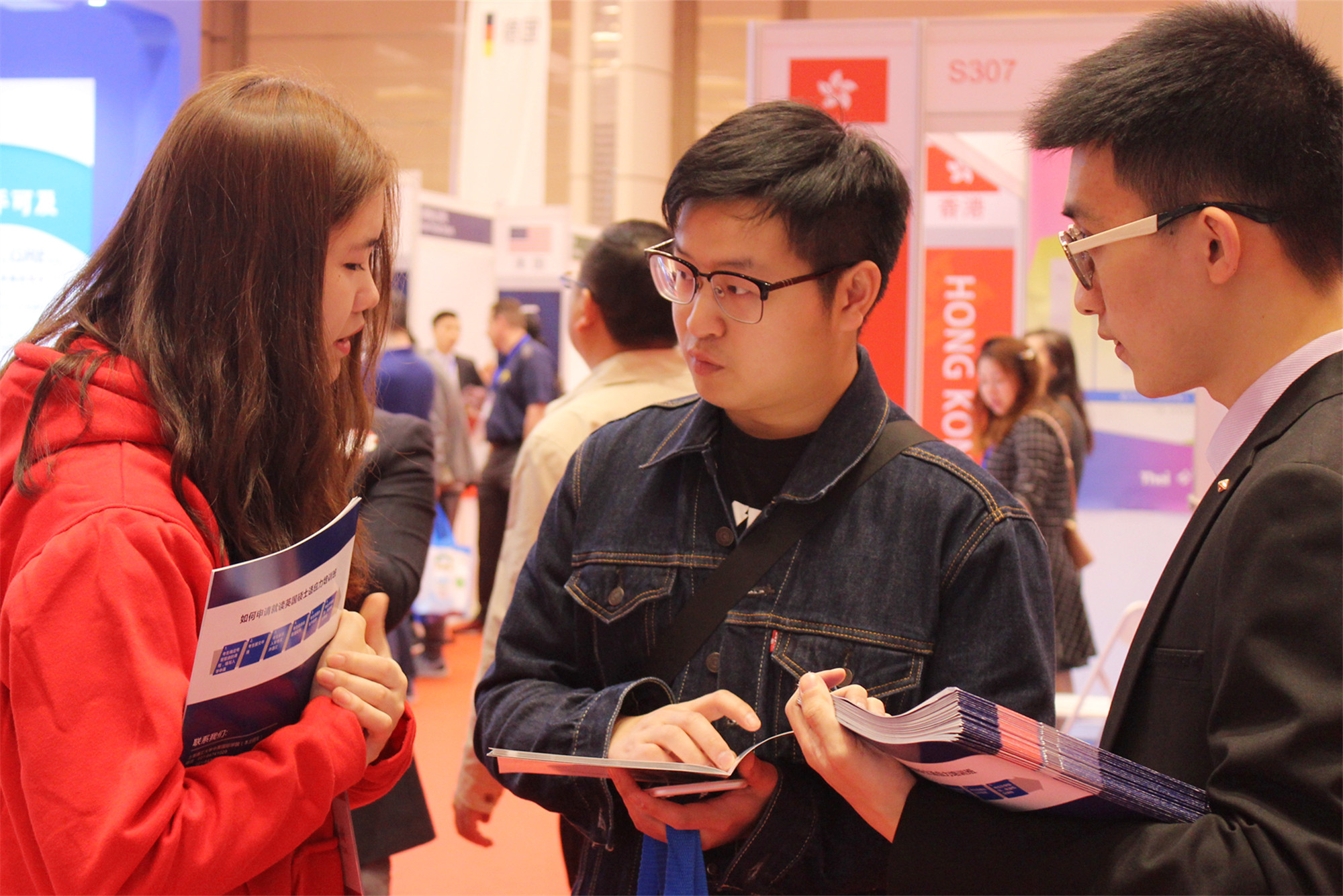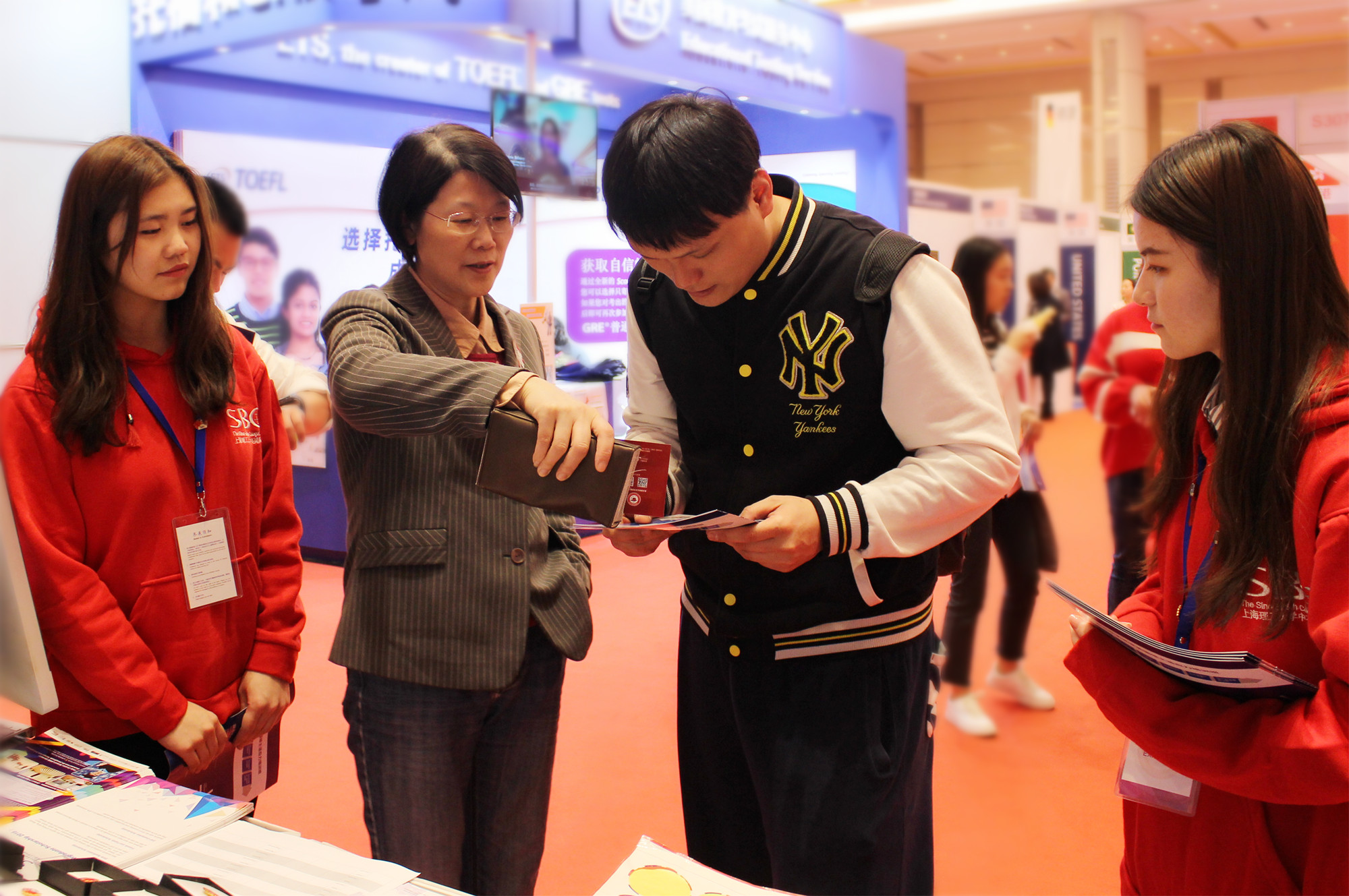 值得一提的是,展台唱主角的都是学院大一的学生志愿者们,来自工商管理专业的张莞尔同学、陈一纯同学和谢烨同学前来助阵,分别承担起展台布置、参股线路设计、为前来展台咨询的海内外学生及家长提供咨询和翻译等工作,现场气氛热烈,学生志愿者们大方得体的形象和专业的服务也得到了参观者的一致好评。