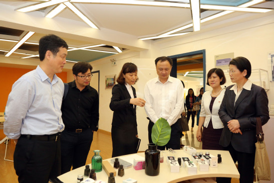 报告会结束后,许涛司长一行和李永智副主任在丁晓东校长、田蔚风副校长以及中英国际学院负责人的陪同下先后参观了学院学生服务中心和学生创业创新中心,观摩了在校学生创业创新项目团队“星墨”研发的彩色墨水产品展示和中英国际学院首个科创社团机器人社团的作品展示。