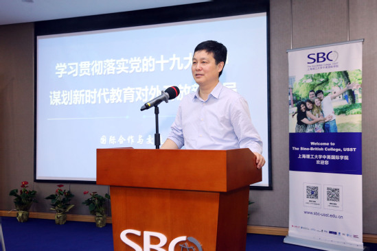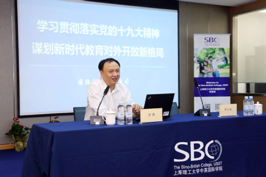 5月22日上午,由上海市教委主办、上海理工大学中英国际学院承办的《学习贯彻落实党的十九大精神 谋划新时代教育对外开放新格局》报告会在学院举行。教育部国际司司长许涛做报告。教育部国际司政策规划处处长舒刚波,教育部国际司涉外监管和办学处副处长王义,上海市教育委员会副主任李永智,上海市教育委员会国际交流处副处长芦琍琍,上海市教育委员会国际交流处副调研员黄培,校长丁晓东,副校长、中英国际学院院长田蔚风以及学校相关部门领导出席报告会。上海市各高等学校、各区教育局分管外事副校(局)长、国际交流处处长、外事干部及上海市教委直属事业单位、直属学校相关负责人160余人参会。报告会由市教委副主任李永智主持。