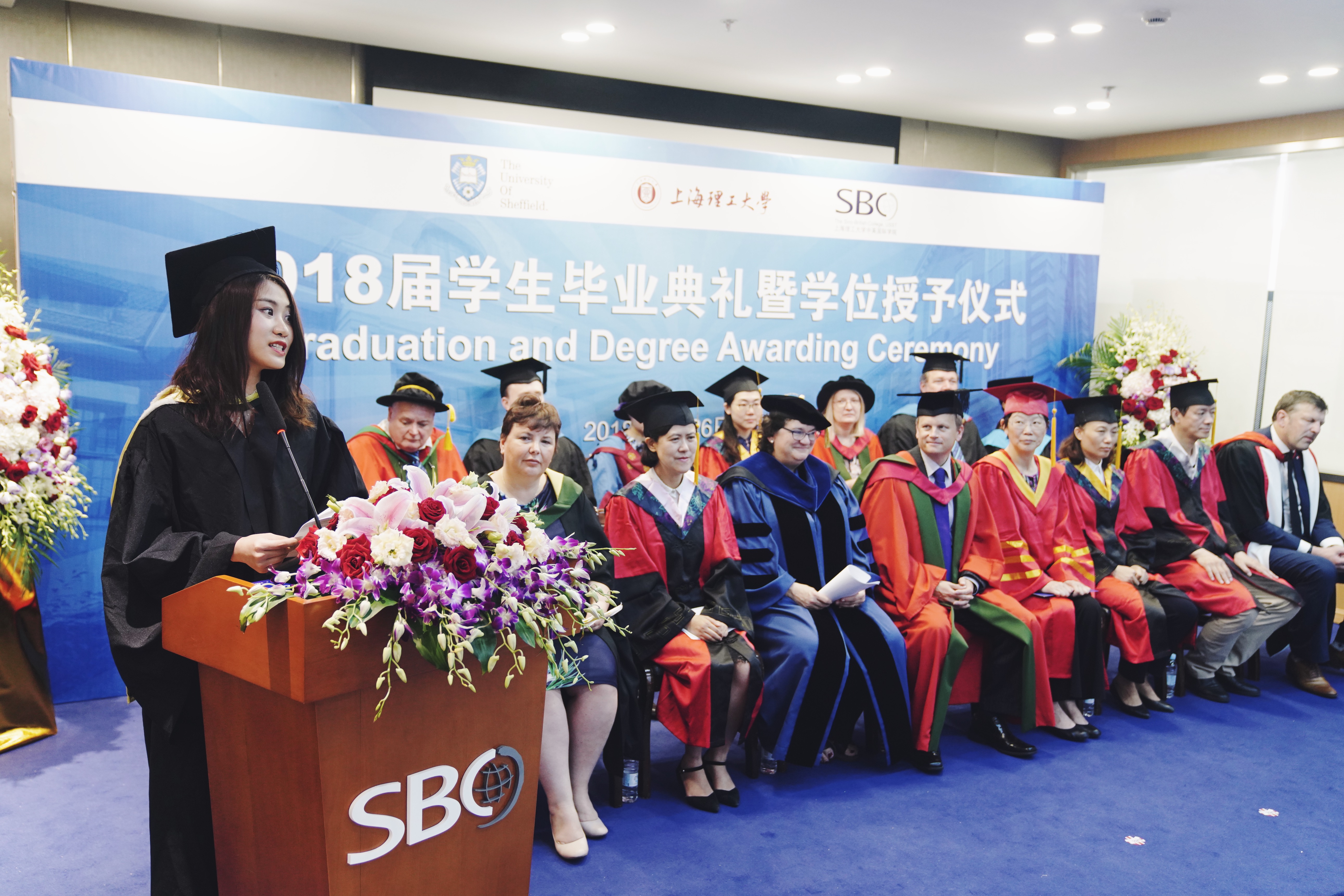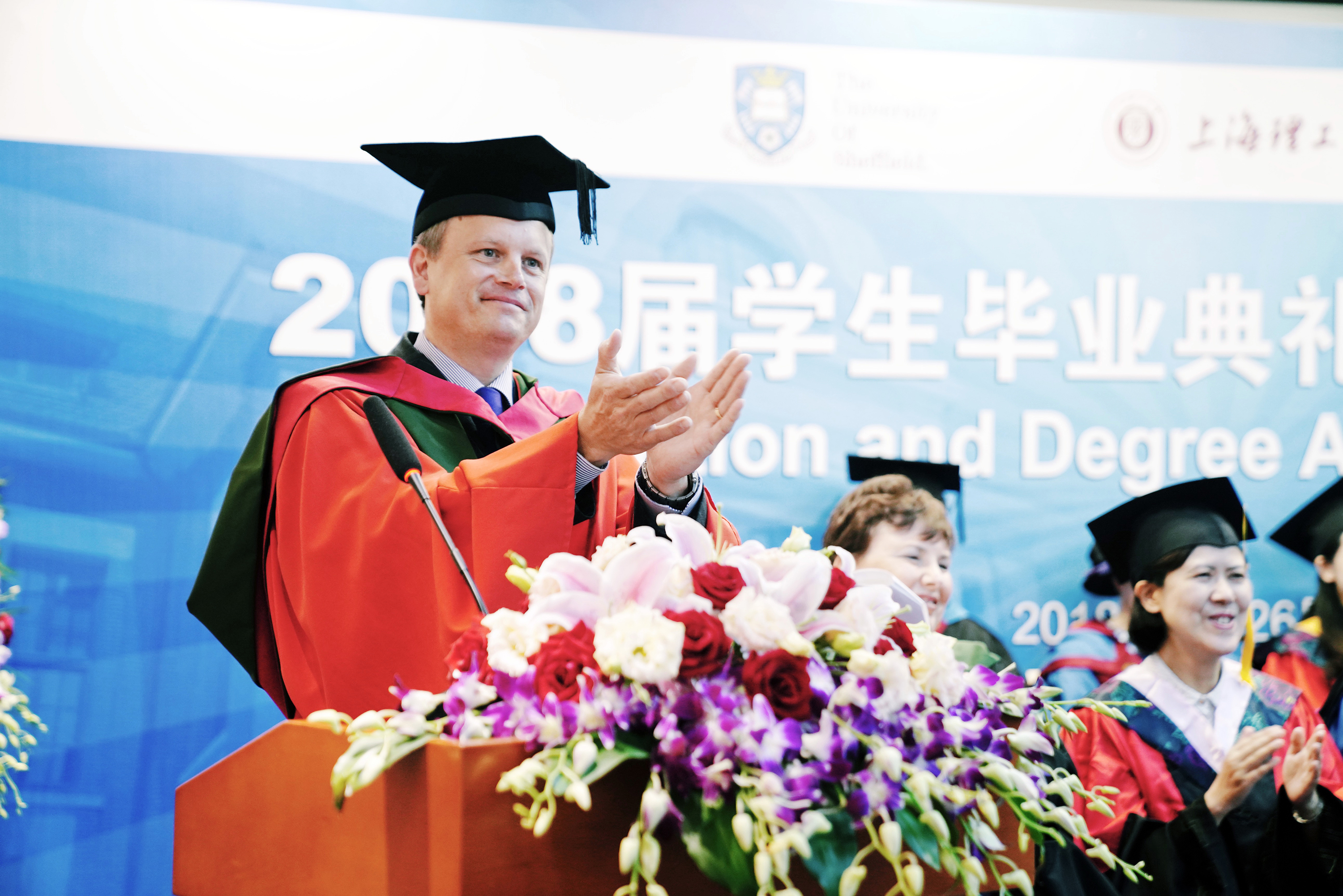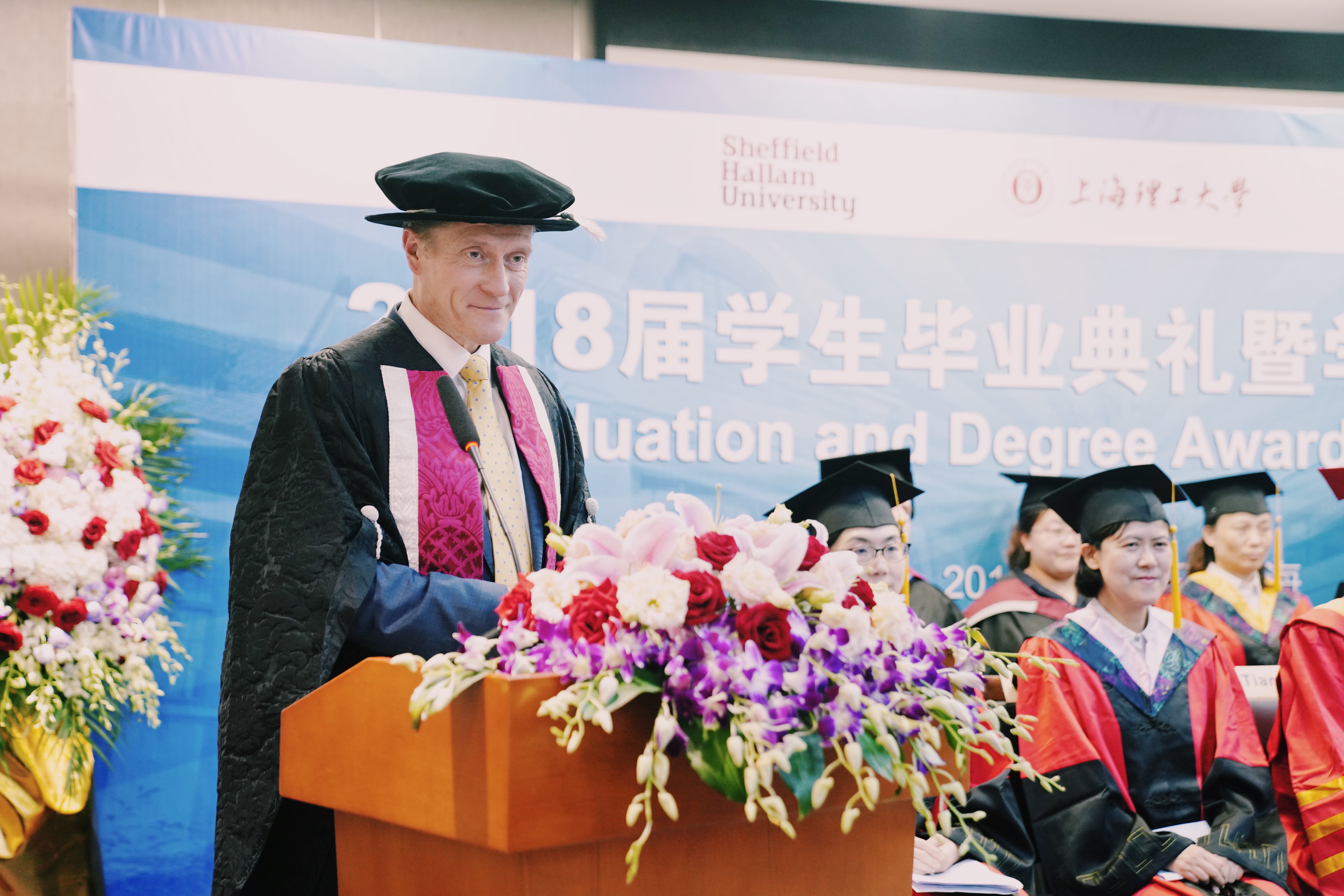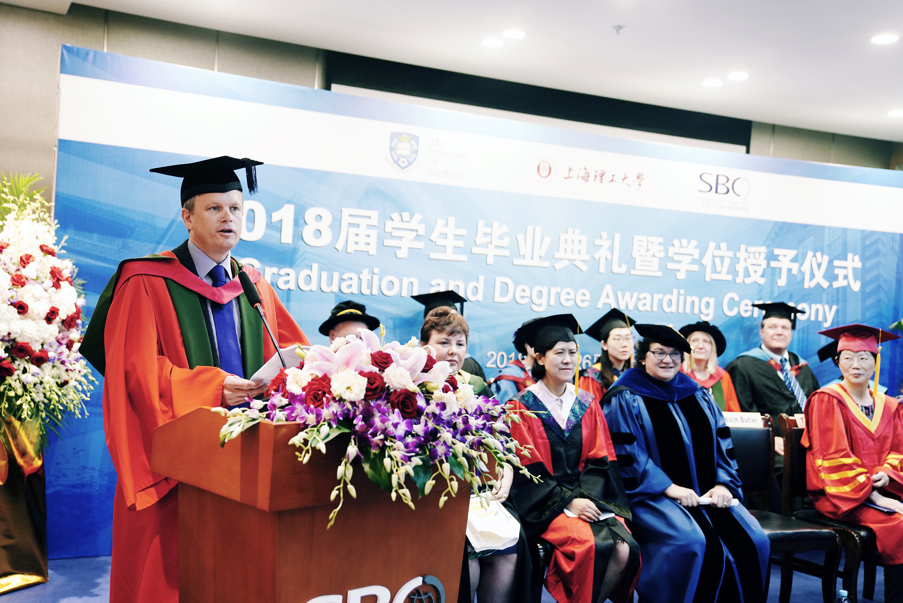 谢菲尔德大学国际合作副校长Malcolm Butler博士首先用精心练习的中文为现场每一位工商管理专业毕业生送上了最诚挚的祝福,并在毕业典礼致辞中表示:“谢菲尔德大学致力于通过思想和知识的力量和应用,把这个世界变得更加美好。作为毕业生的你们,是实现这些变化的中坚力量。我希望你们,作为令人自豪的谢菲尔德大学和上海理工大学毕业生,能够继续致力于影响世界、脱颖而出。这一切只是一个开始,梦想从这里起航!”