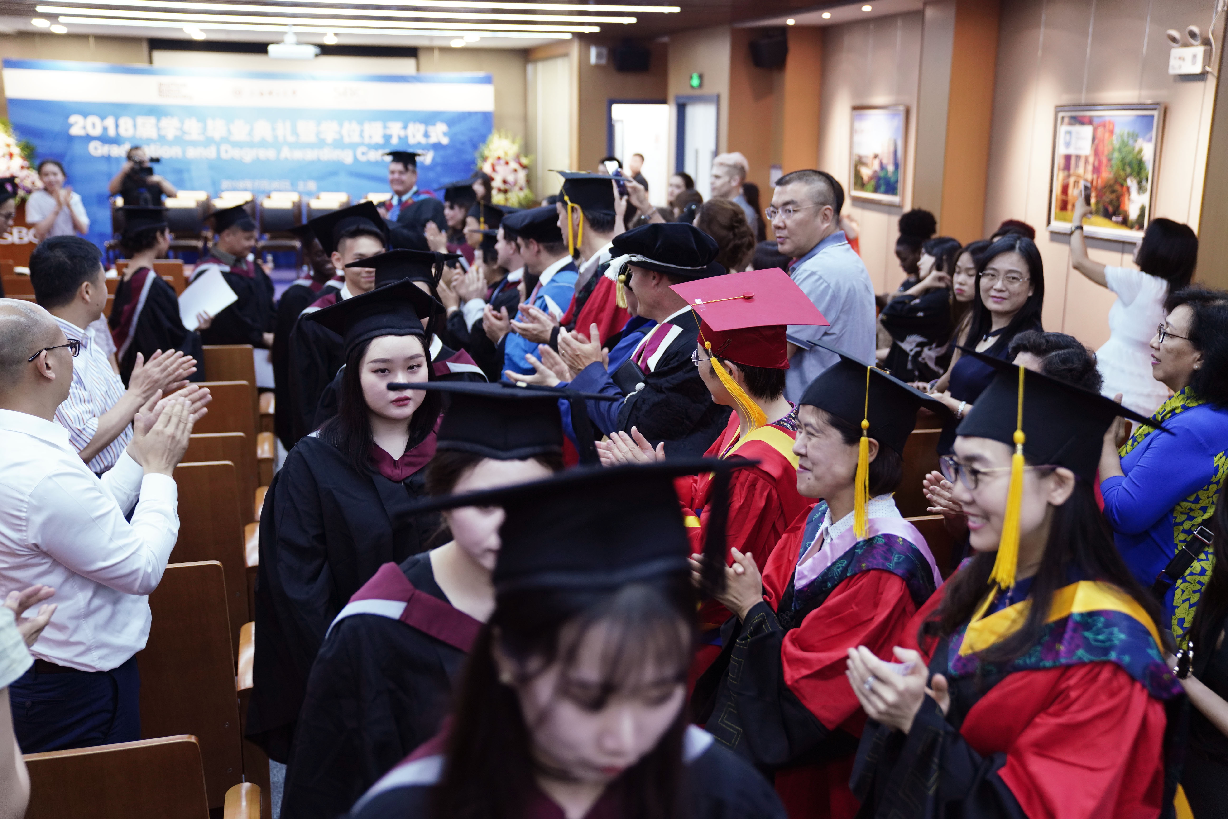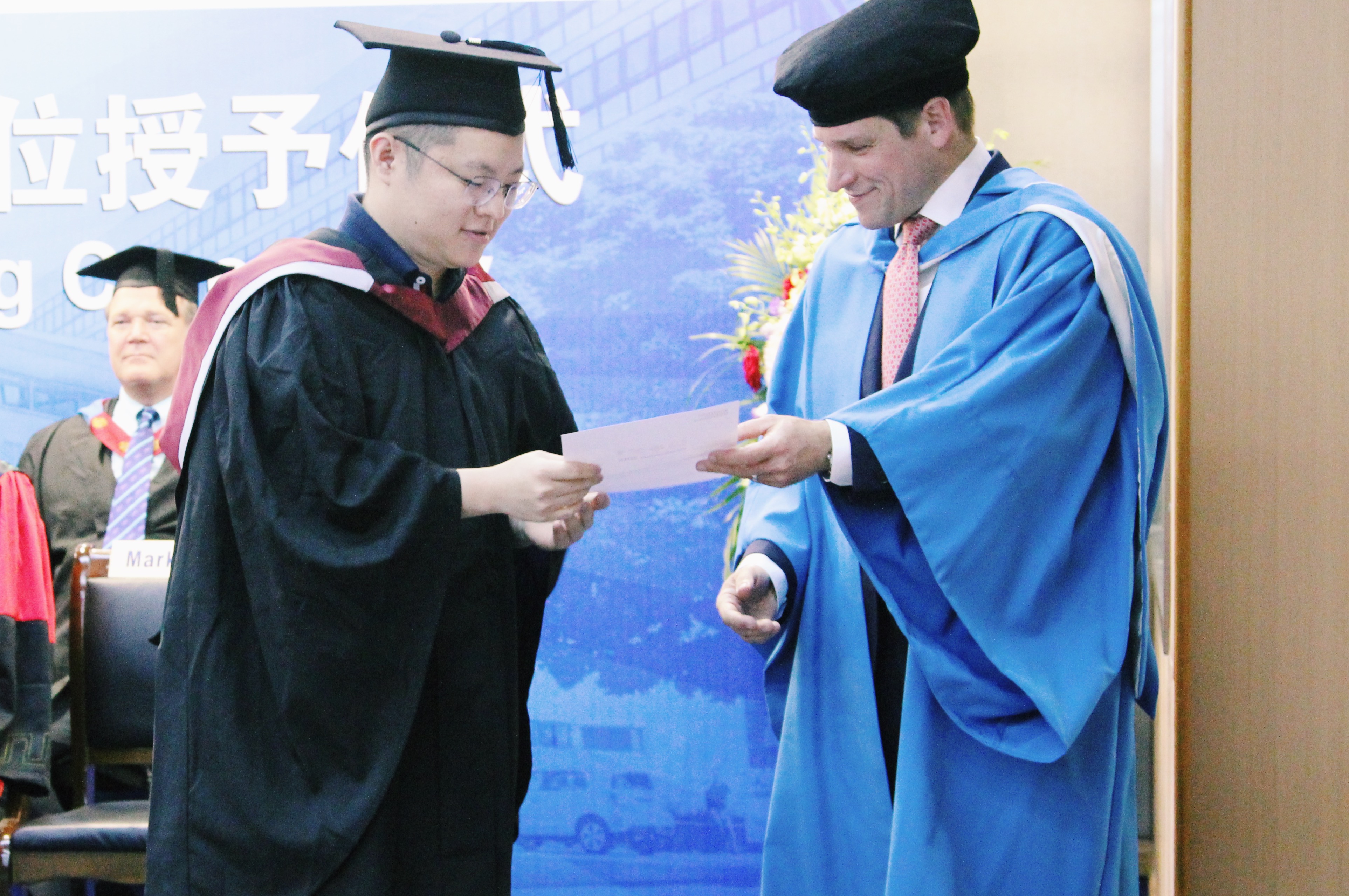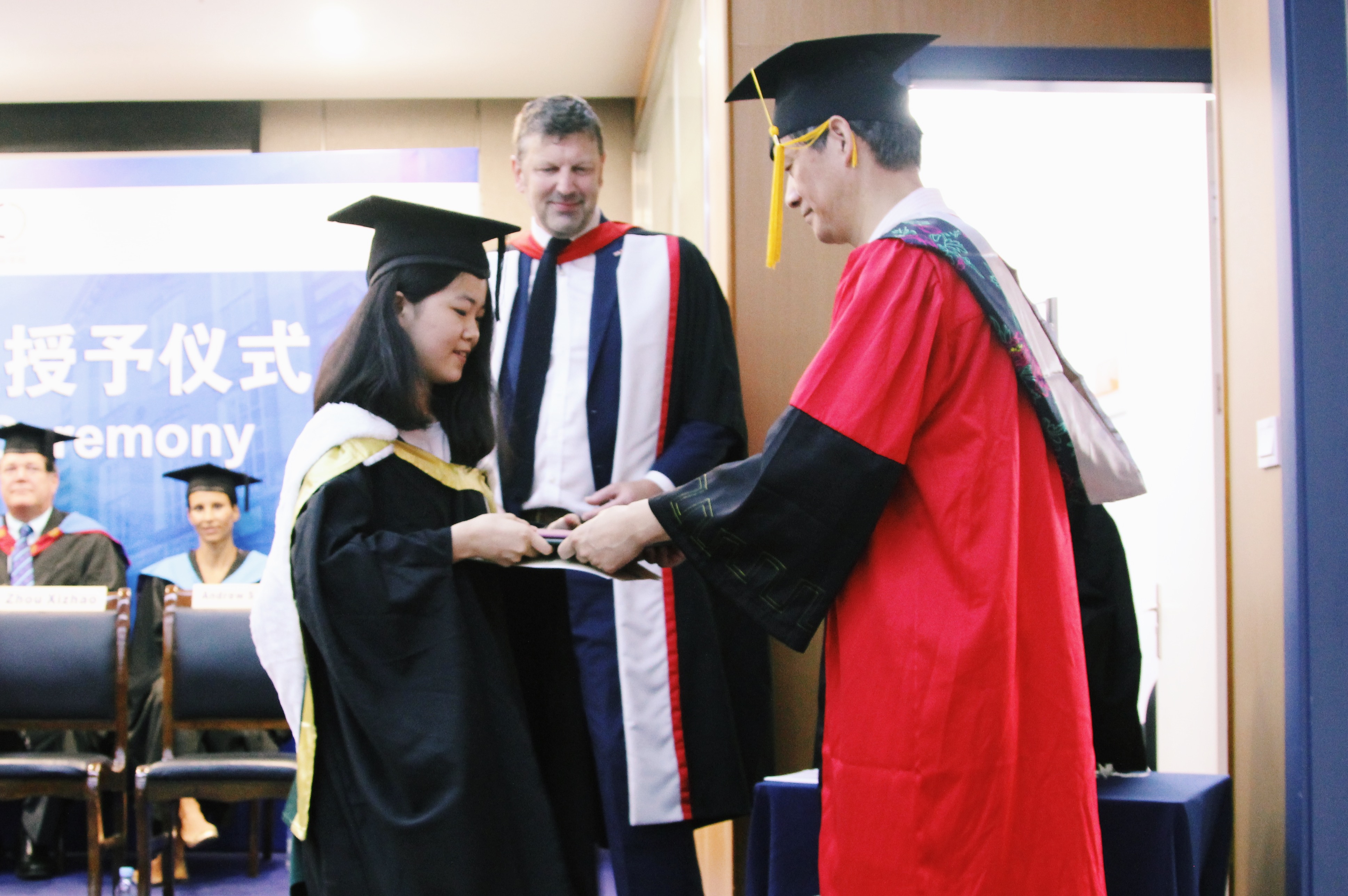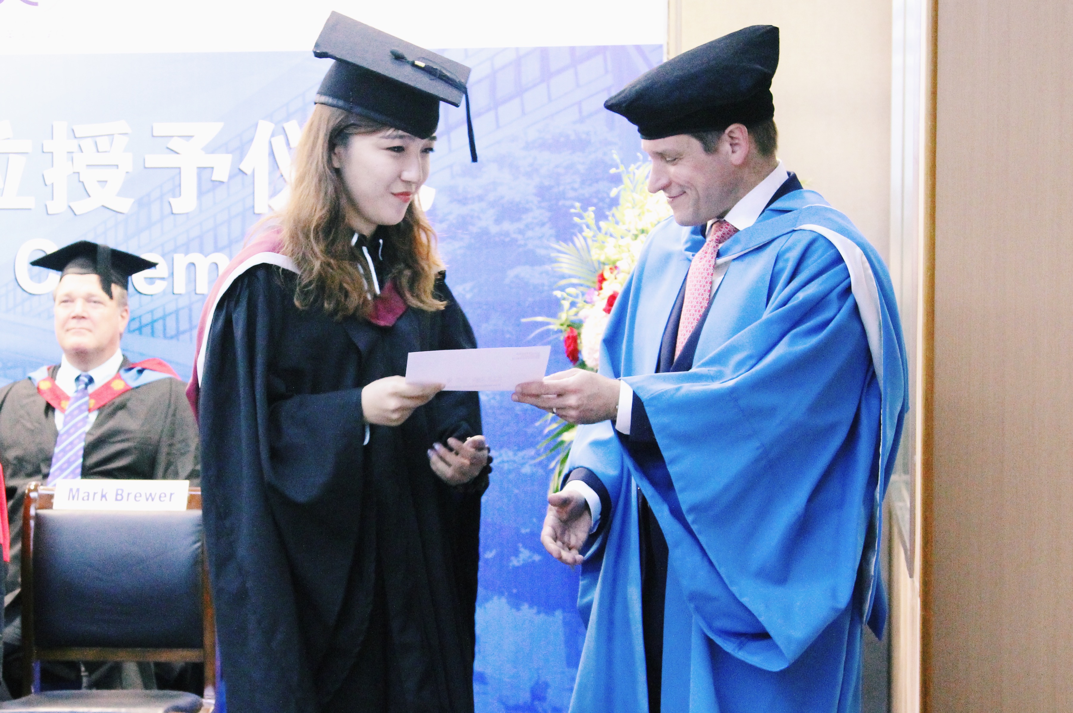 中英国际学院行政副院长徐琳主持典礼,常务副院长、代行执行院长刘芹教授在仪式上宣读2018届毕业生名单,毕业生们依次走上讲台,与中英双方校领导一一握手勉励并合影留念,教授们亲手为到场的毕业生颁发毕业证书及学位证书,毕业生们在接过学位证书后,喜悦之情溢于言表。