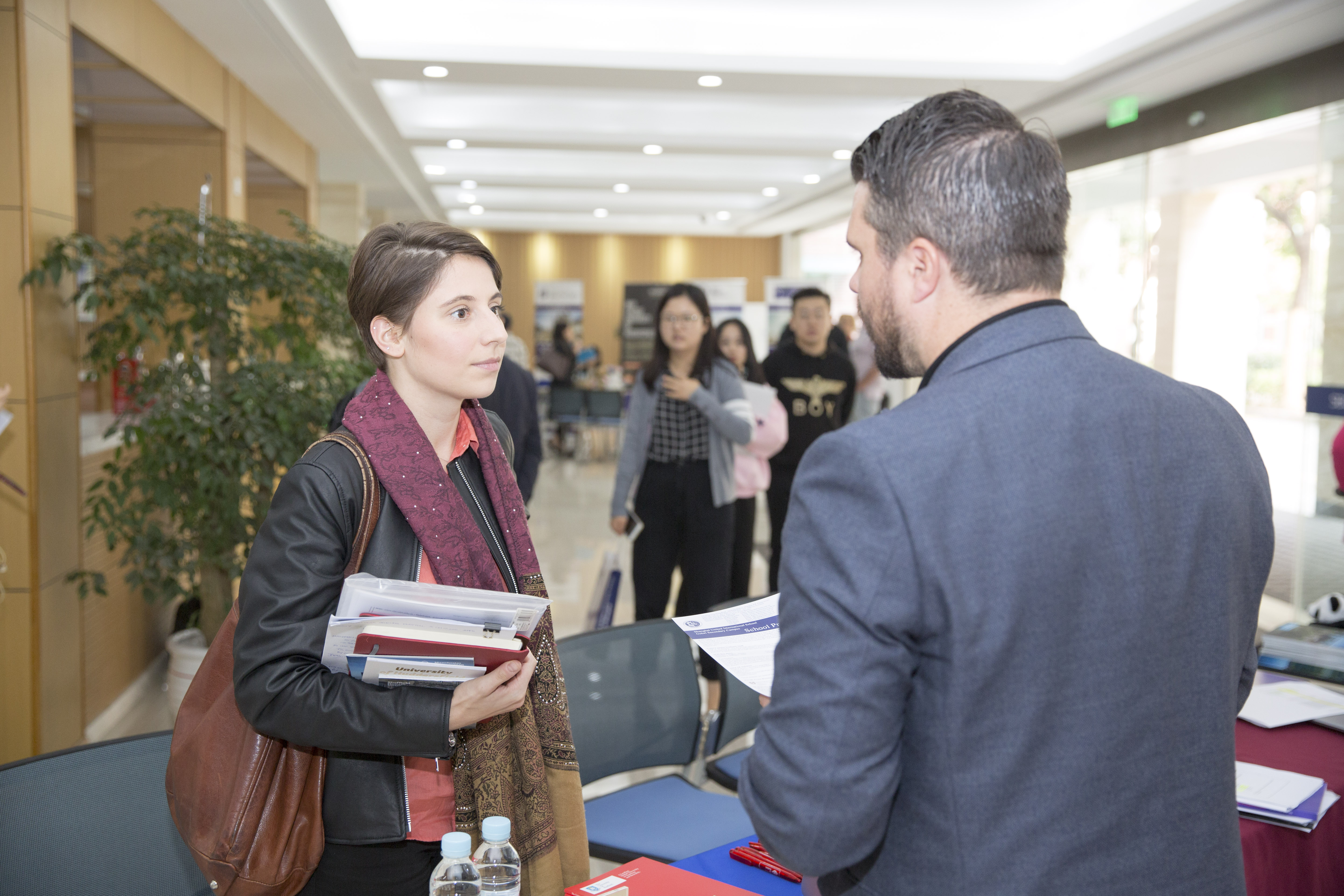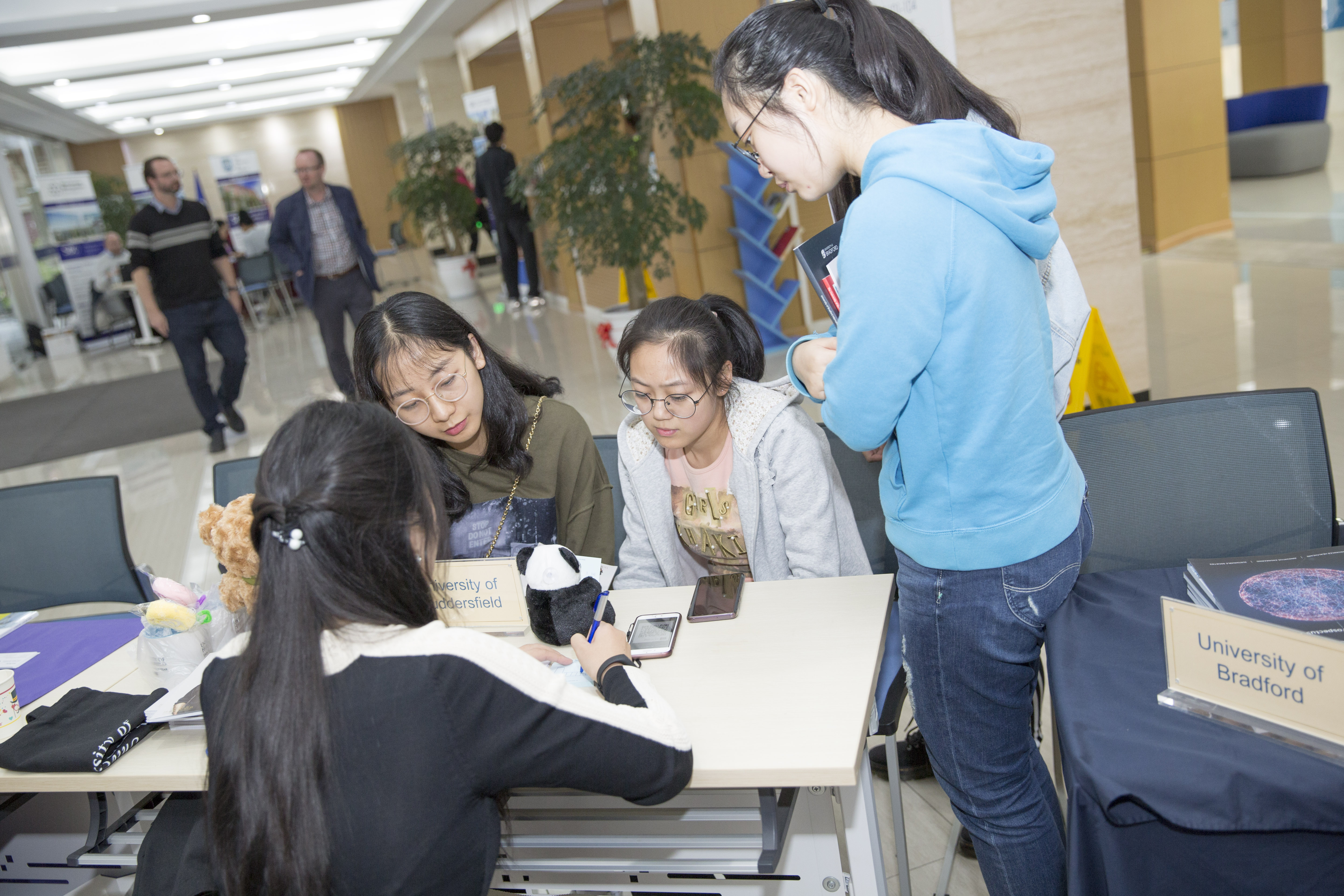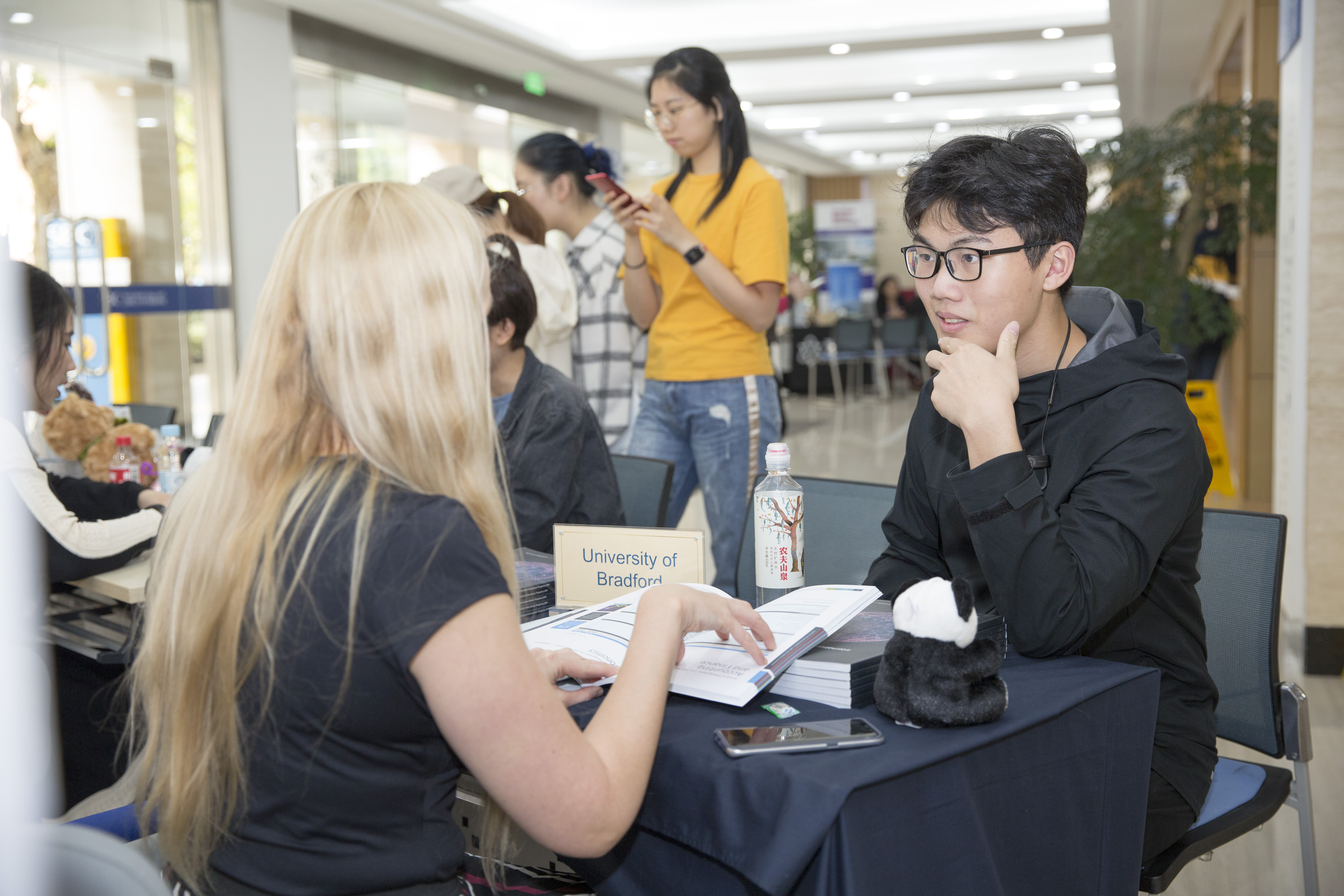 本次展会在教学楼教室及一楼大厅分别设置了讲座与咨询展台,讲座详细介绍了九所英国合作大学基本情况、课程学习、专业方向及就业前景等方面的信息。在咨询会现场,英方合作大学代表为校学生设立了互动交流平台,一对一为学生们在学习和就业方面的问题提供了针对性的专业指导。