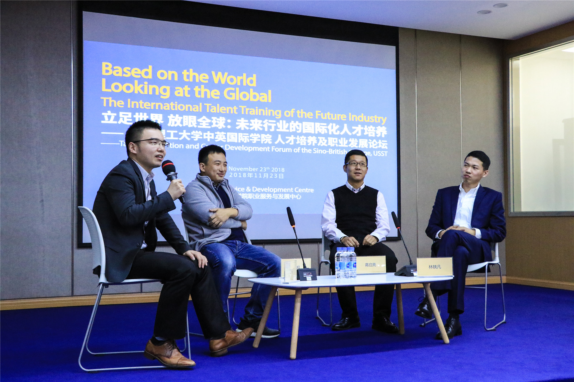 11月23日,中英国际学院特邀德国WALDNER实验室系统公司中国区副总裁林轶凡先生、上汽大通总经理办公室主任蒋启亮先生、现某股份制银行科技中心人事负责人王超先生共聚一堂,举办了“立足世界 放眼全球:未来行业的国际化人才培养“的论坛,从企业端视角解读如今高校毕业生就业的市场环境,探讨中国招聘市场现状和未来发展的趋势以及企业端对大学生人才的期望和要求等。此次讲座吸引了来自中英国际学院师生120余人参加,中英国际学院党总支书记、复兴路校区管理委员会副主任李妍出席活动。学院职业服务与发展部主管张卫老师主持论坛。