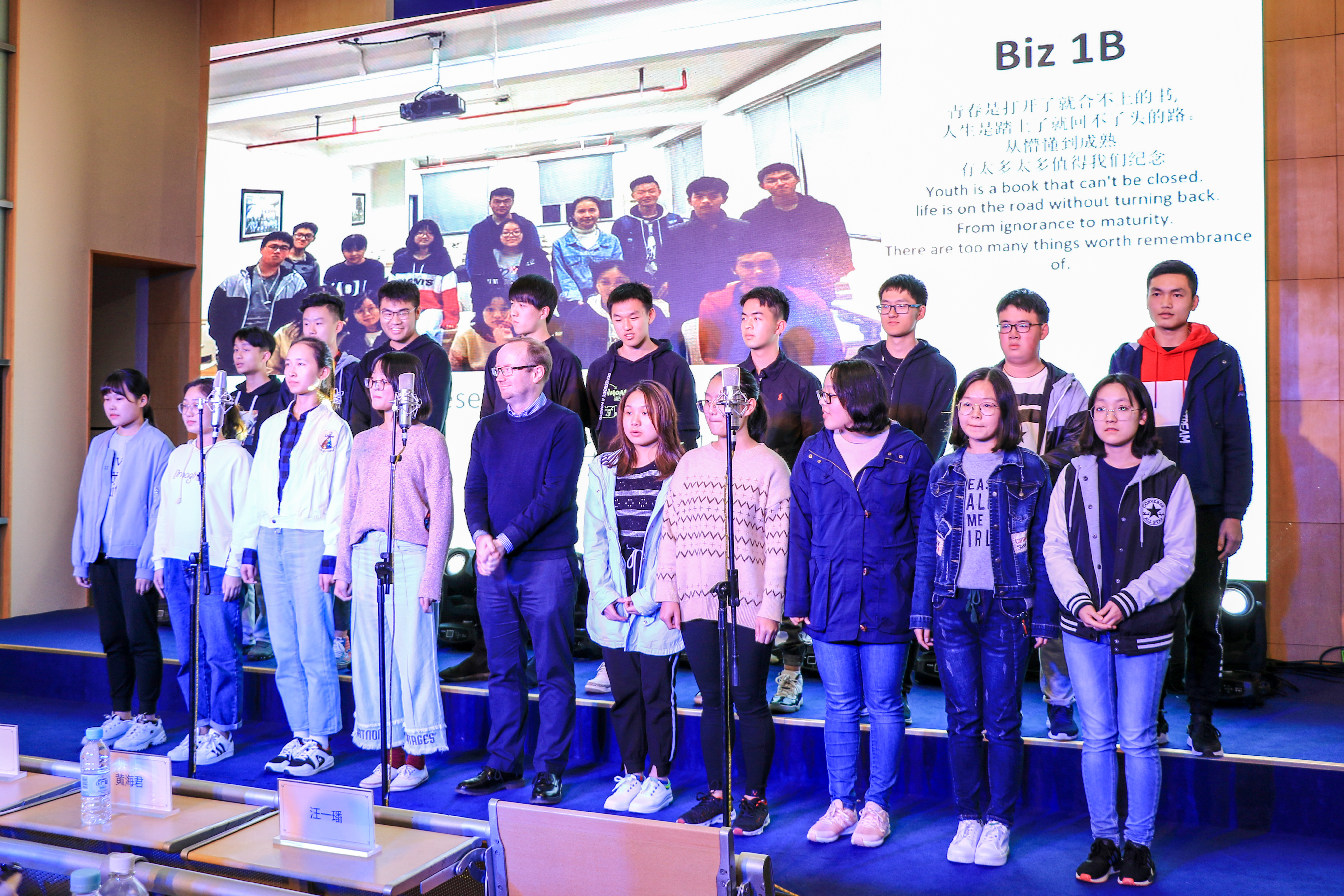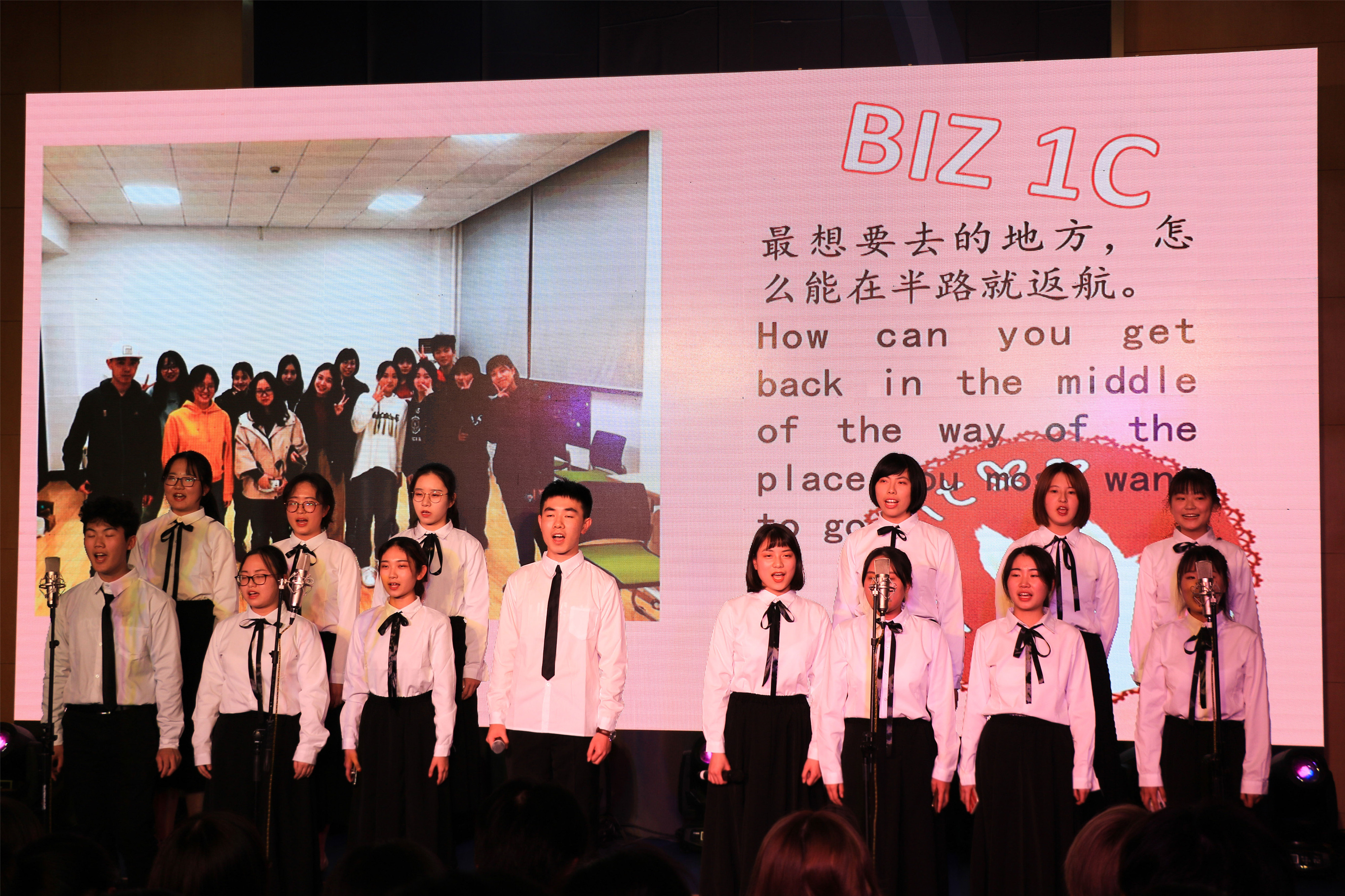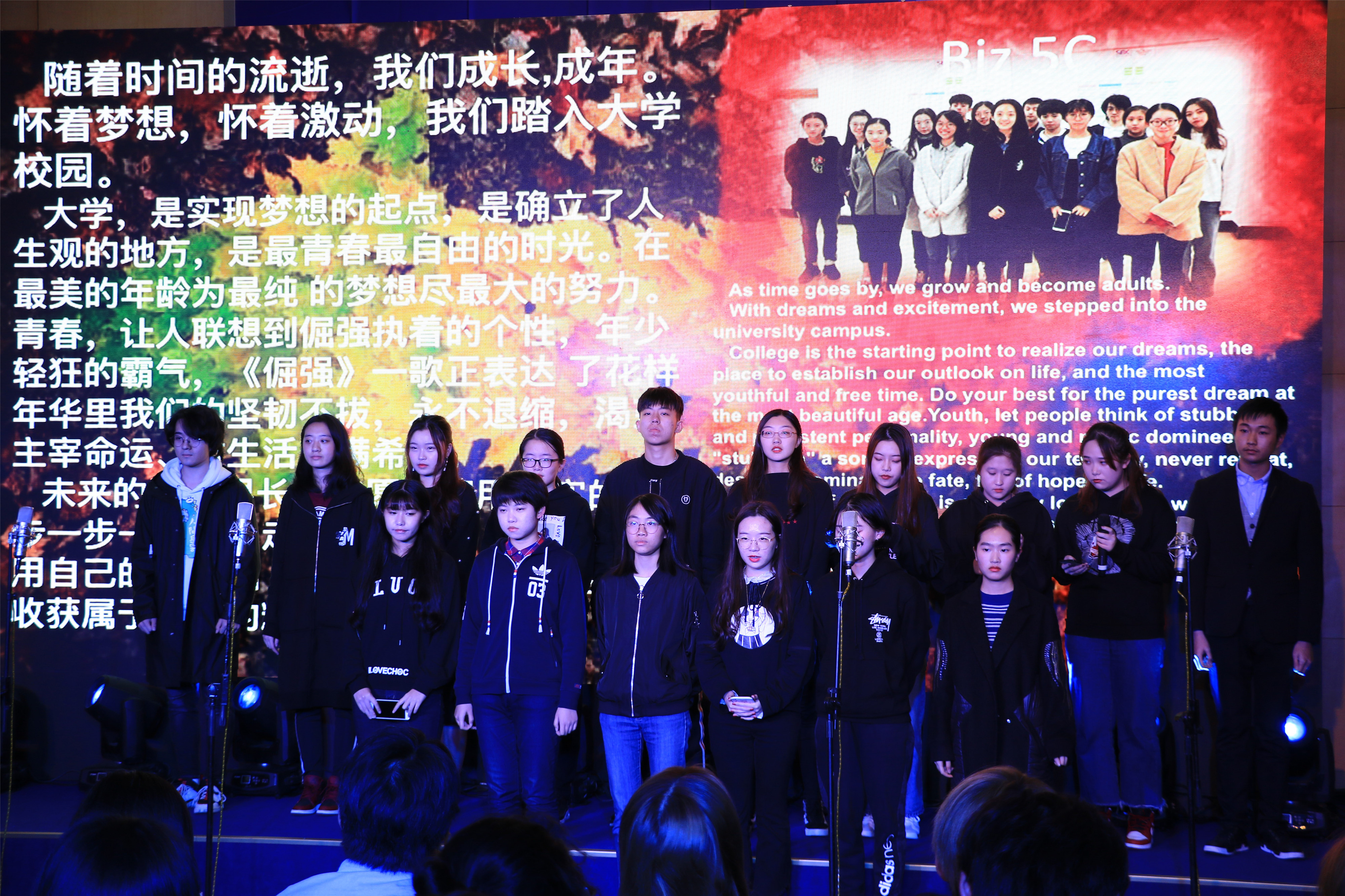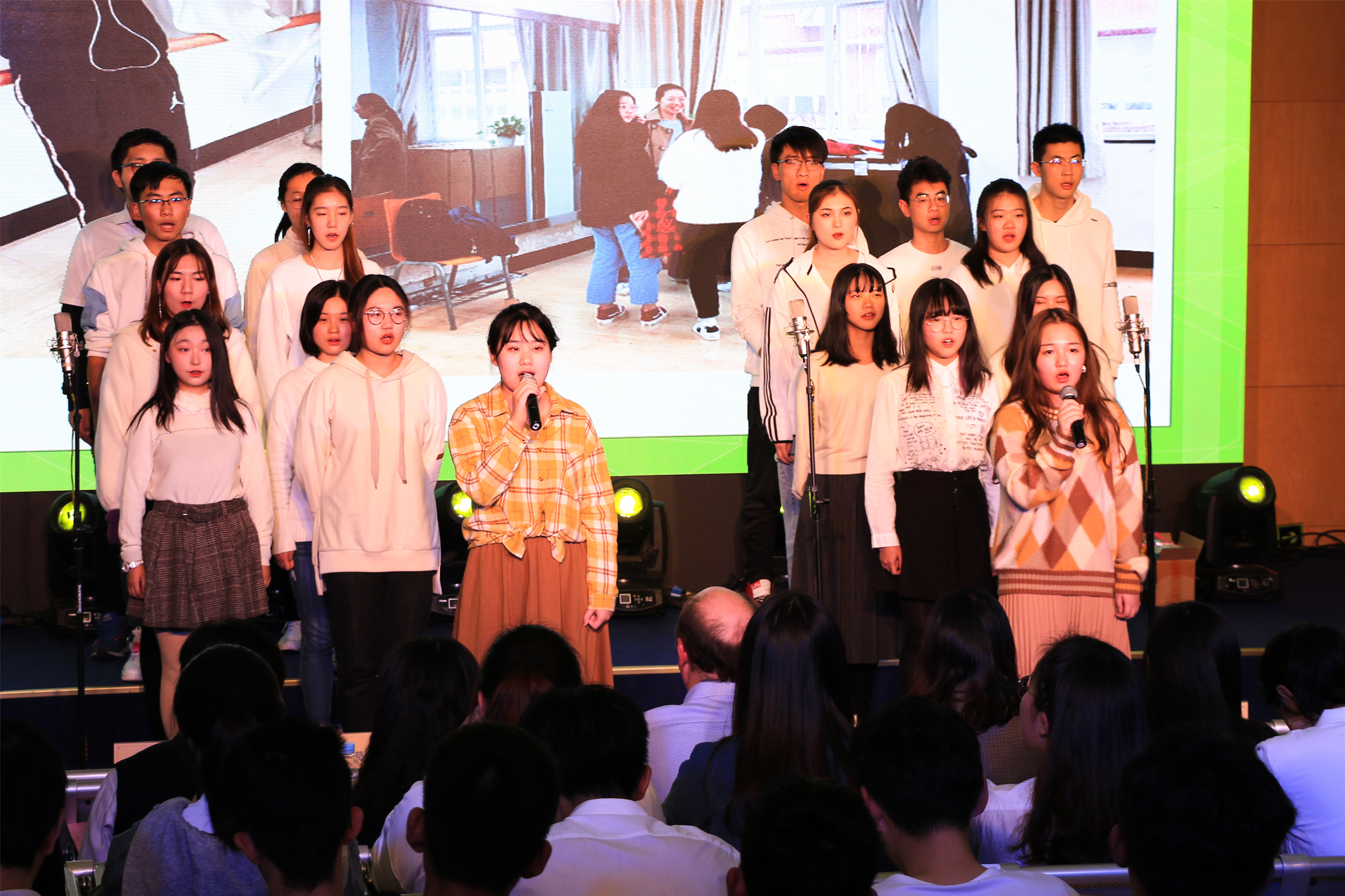 回顾视频记录了同学们过去三个月的学习生活,一张张熟悉的面孔青涩却懵懂。作为中英国际学院的新生力量,他们肩负的不仅仅是自己的梦想,同时也承载着学院对他们深深的期待。李妍书记在致辞中表示,“希望通过这样一个平台让同学们真正理解‘集体的意义’,充分展示班级的风采,享受比赛的过程,赛出真实的自己。“ 当欢快动感的《青春纪念册》音乐响起时,正式拉开了此次合唱比赛的帷幕。一首首追逐梦想,永不放弃的乐曲将我们带入一串串回忆之中,时光留给我们的不仅仅是想念与感动,还有深藏在心底的梦想与未来。“