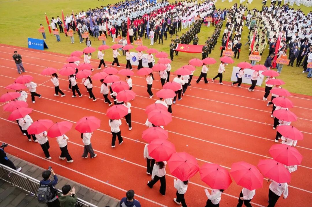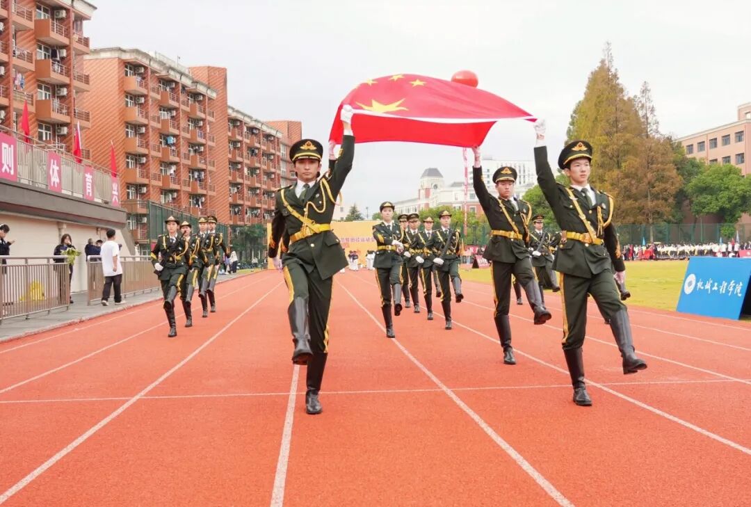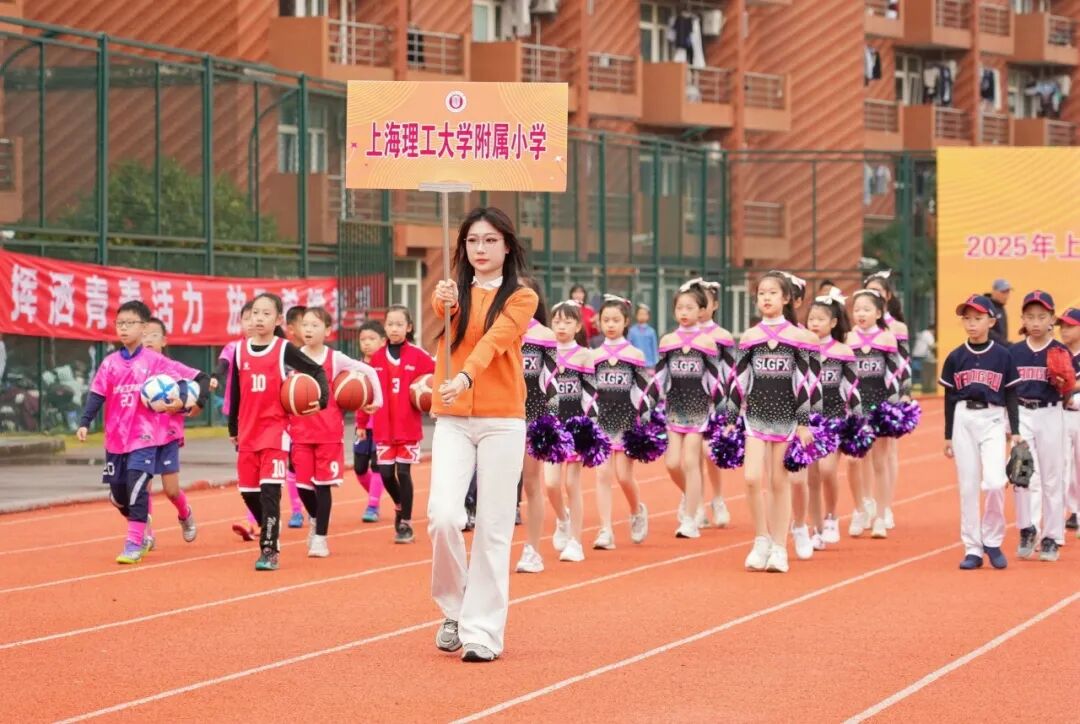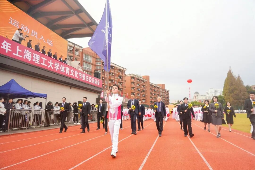 学校国旗仪仗队高擎五星红旗,庄严入场。伴随着激昂的运动员进行曲,各代表队方阵紧随其后。上海理工大学附属小学、附属中学、附属储能中学的学生们率先亮相,各个学院运动队以各具特色的方式依次入场,展现出广大学子的青春活力。