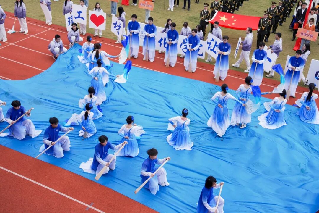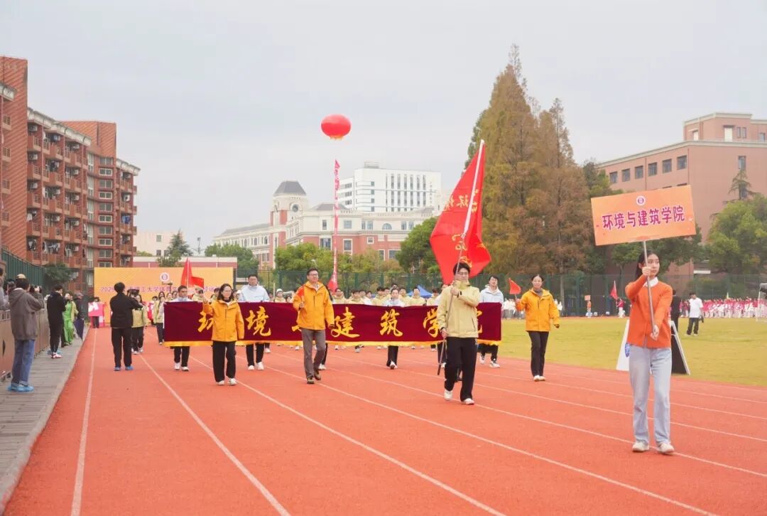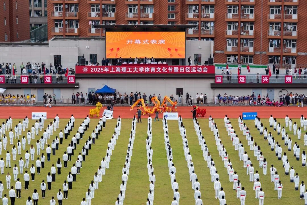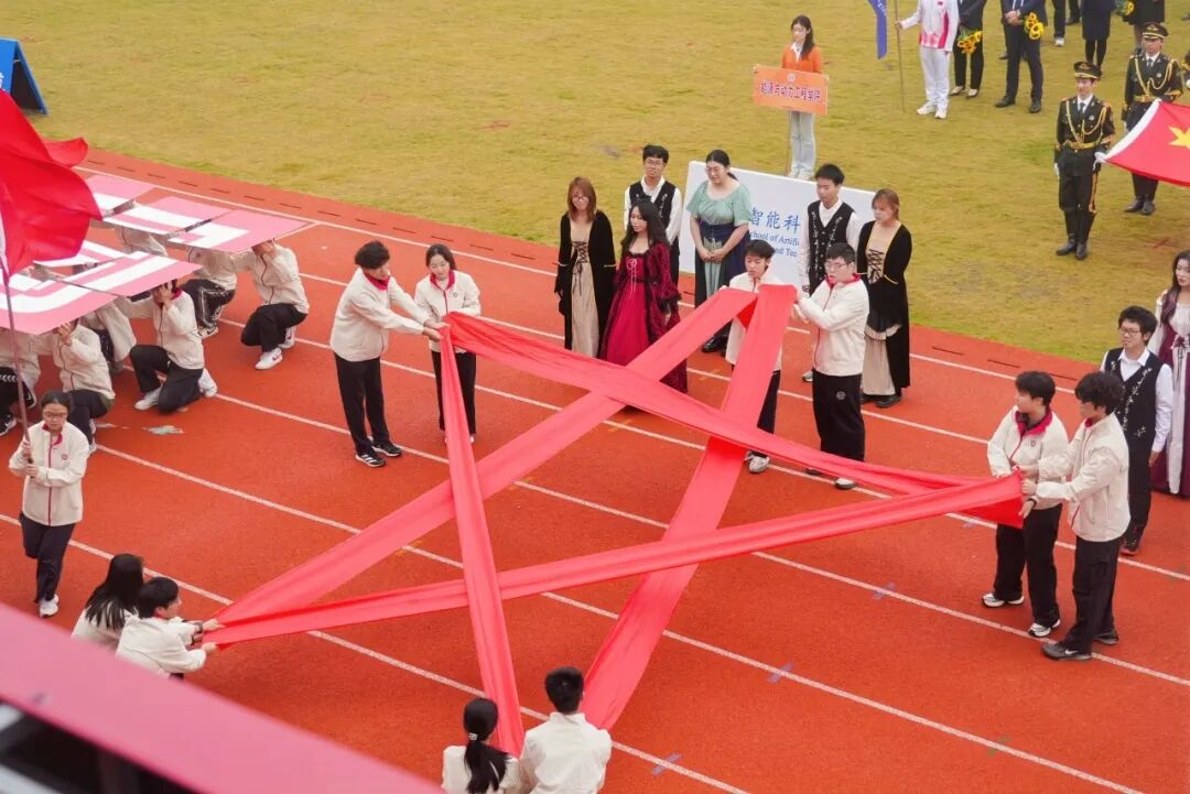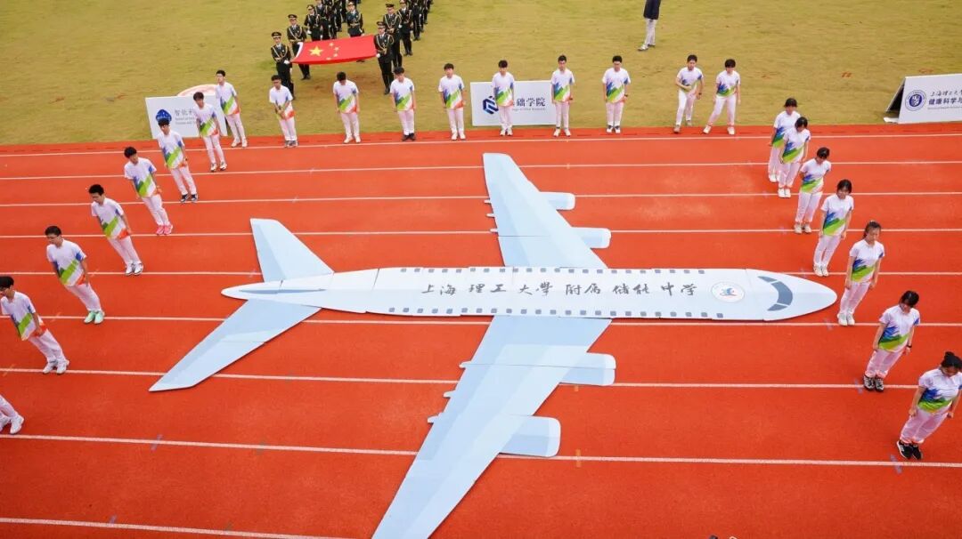 学校国旗仪仗队高擎五星红旗,庄严入场。伴随着激昂的运动员进行曲,各代表队方阵紧随其后。上海理工大学附属小学、附属中学、附属储能中学的学生们率先亮相,各个学院运动队以各具特色的方式依次入场,展现出广大学子的青春活力。